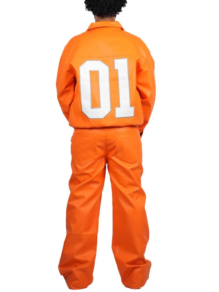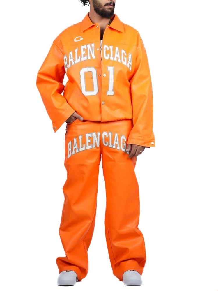 طقم جلد ب ستايل جديد - جاكيت وبنطلون باللون البرتقالي الجريء